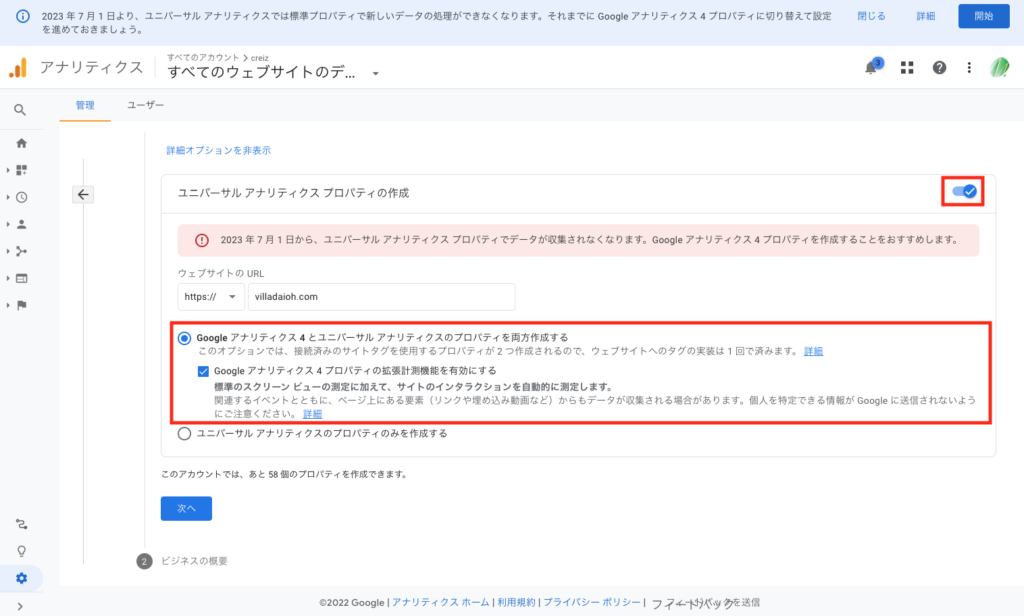 「グーグルアナリティクス4とユニバーサルアナリティクスのプロパティを両方作成する」にチェックが入っている事を確認して「次へ」ボタンをクリック。