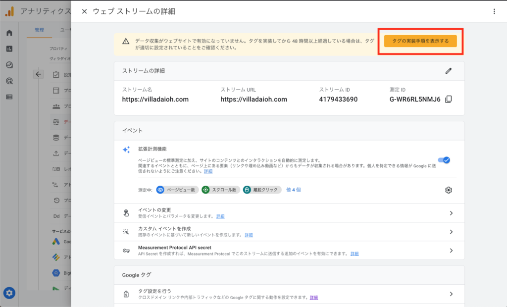 「ウェブ ストリームの詳細」が出てくるので、「タグの実装手順を表示する」ボタンをクリックします。