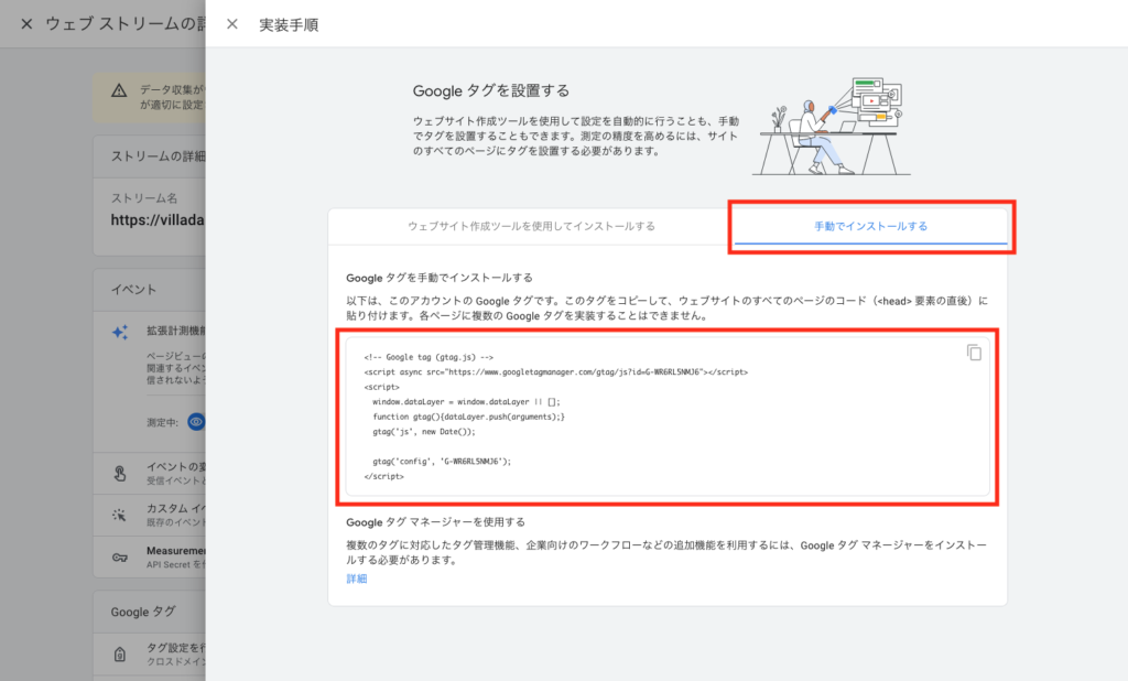 「手動でインストールする」タブを押して、「Google tag (gtag.js) 」タグをコピーして貼り付けてください。