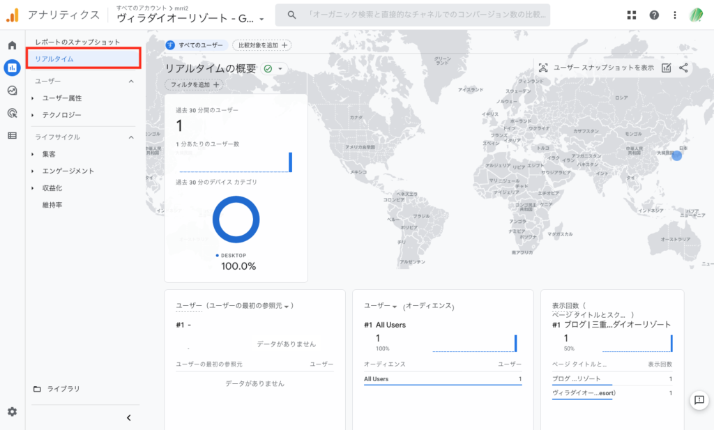 アナリティクスの「レポート→リアルタイム」をクリックし、