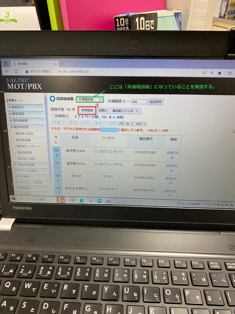 ※この時、緑の枠は「共通電話帳」になっているか確認します。(なってなかったら「共通電話帳」にする)