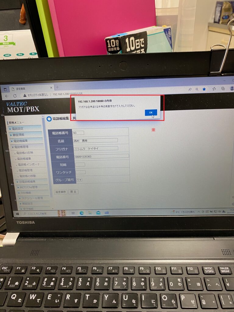 ※ 「名前、フリガナ の入力の仕方を間違っている」「既に電話帳に登録されている電話番号を新規で追加しようとしている」など、新規登録の時に行っている場合、赤枠の箇所にポップアップが表示されることがあります。その場合は、「OK」ボタンを押し、新規で登録できるよう入力し直すか登録されていない番号を入力してから再度、「設定保存」ボタンを押してください。