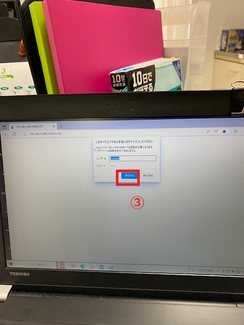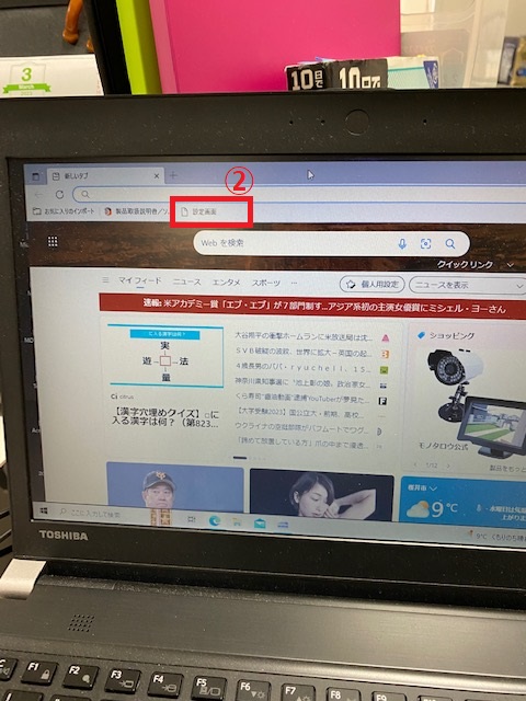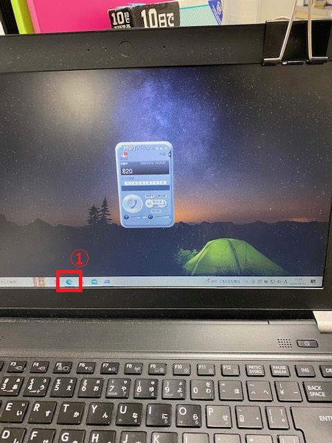 ①中籔さんの机にあるノートパソコンからMicrosoft Edgeを起動します。